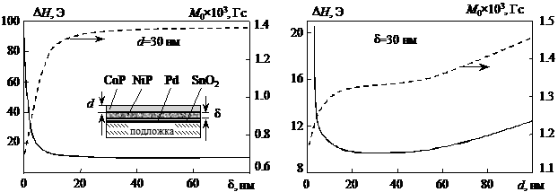 Впервые показано, что высокочастотные свойства химически осажденных "рентгено-аморфных" пленок можно существенно улучшить, если при их получении предварительно на подслой палладия осадить буферный немагнитный, но аморфный слой определенной толщины. В качестве буферного слоя может использоваться пленка Ni-P, получаемая также химическим осаждением, но с содержанием фосфора в ней более 7%, когда она становится немагнитной. На рисунке показаны зависимости ширины линии ФМР и эффективной намагниченности насыщения, снятые от толщины немагнитной прослойки δ при фиксированной толщине магнитной пленки d и наоборот.