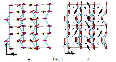 Более сложная магнитная структура ферробората гольмия HoFe3(BO3)4 обусловлена конкуренцией анизотропных вкладов магнитных подсистем железа и гольмия. Ниже TN магнитная структура (рис. 1а), как и в ферроборате иттрия, является легкоплоскостной, но третья часть ионов Fe3+ имеет ненулевые компоненты магнитных моментов вдоль оси с (красные стрелки). При этом магнитные моменты ионов Ho3+ (желтые стрелки), упорядоченных за счет обменного взаимодействия с ионами железа, также лежат в базисной плоскости. Конкуренция анизотропных вкладов магнитных подсистем приводит к спонтанной спиновой переориентации при ТSR≈5К. Ниже этой температуры магнитные моменты всех ионов железа (красные стрелки на рис. 1б) выстраиваются вдоль оси с, при этом магнитные моменты ионов гольмия (черные стрелки) преимущественно также ориентированы вдоль этой оси, однако часть ионов имеют значительные компоненты в плоскости (a-b).