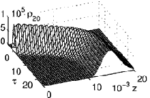 Зависимости нормированной частоты Раби пробного импульса gp и атомной когерентности r20 как функции длины среды и времени. Длина измеряется в единицах длины линейного поглощения, а время - в единицах длитетельности пробного импульса. |
